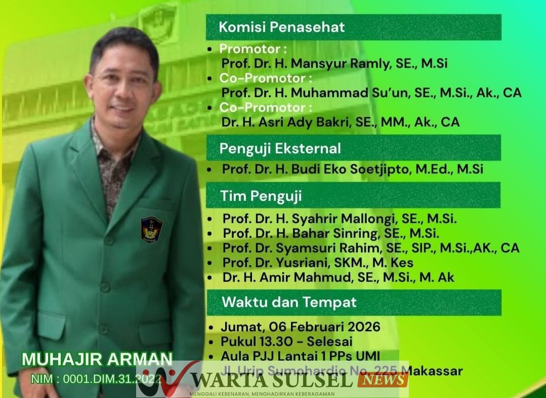 WARTASULSELNEWS. COM – Dosen Universitas Lamappapoleonro (Unipol) Soppeng, Muhajir Arman, kini resmi menyandang gelar Doktor Ilmu Manajemen setelah berhasil menyelesaikan program doktoralnya di Universitas Muslim Indonesia (UMI).