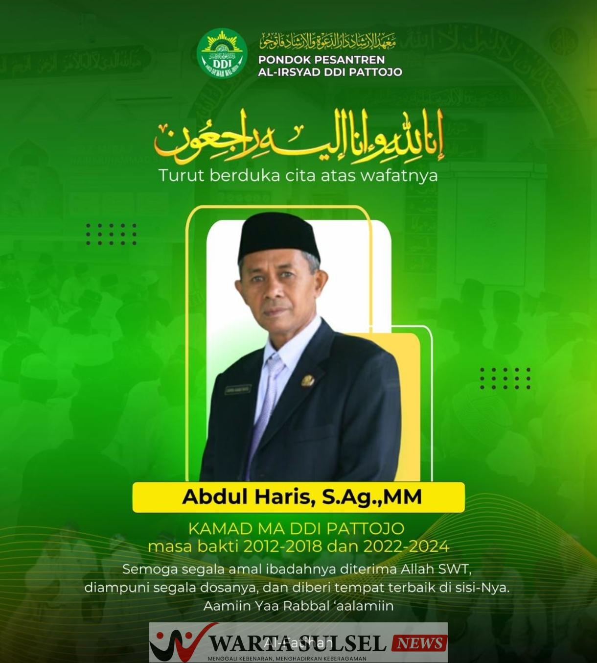 WARTASULSELNEWS.COM – Innalillahi wa Innailaihi Roji’un, berita duka kembali menyelimuti keluarga besar Ponpes DDI Pattojo Kabupaten Soppeng Sulawesi Selatan. Ustadz Abdul Haris, S. Ag., MM dikabarkan telah meninggal dunia pada hari Selasa, 21 April 2026.
