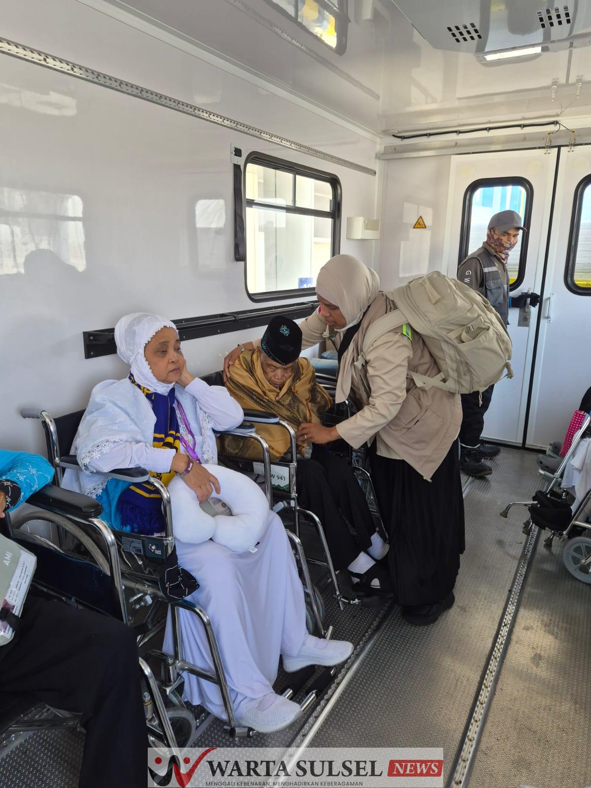 Selain itu untuk Jamaah lansia petugas Kesehatan mendampinginya dengan Kursi Roda yang sudah disiapkan oleh PPIH.