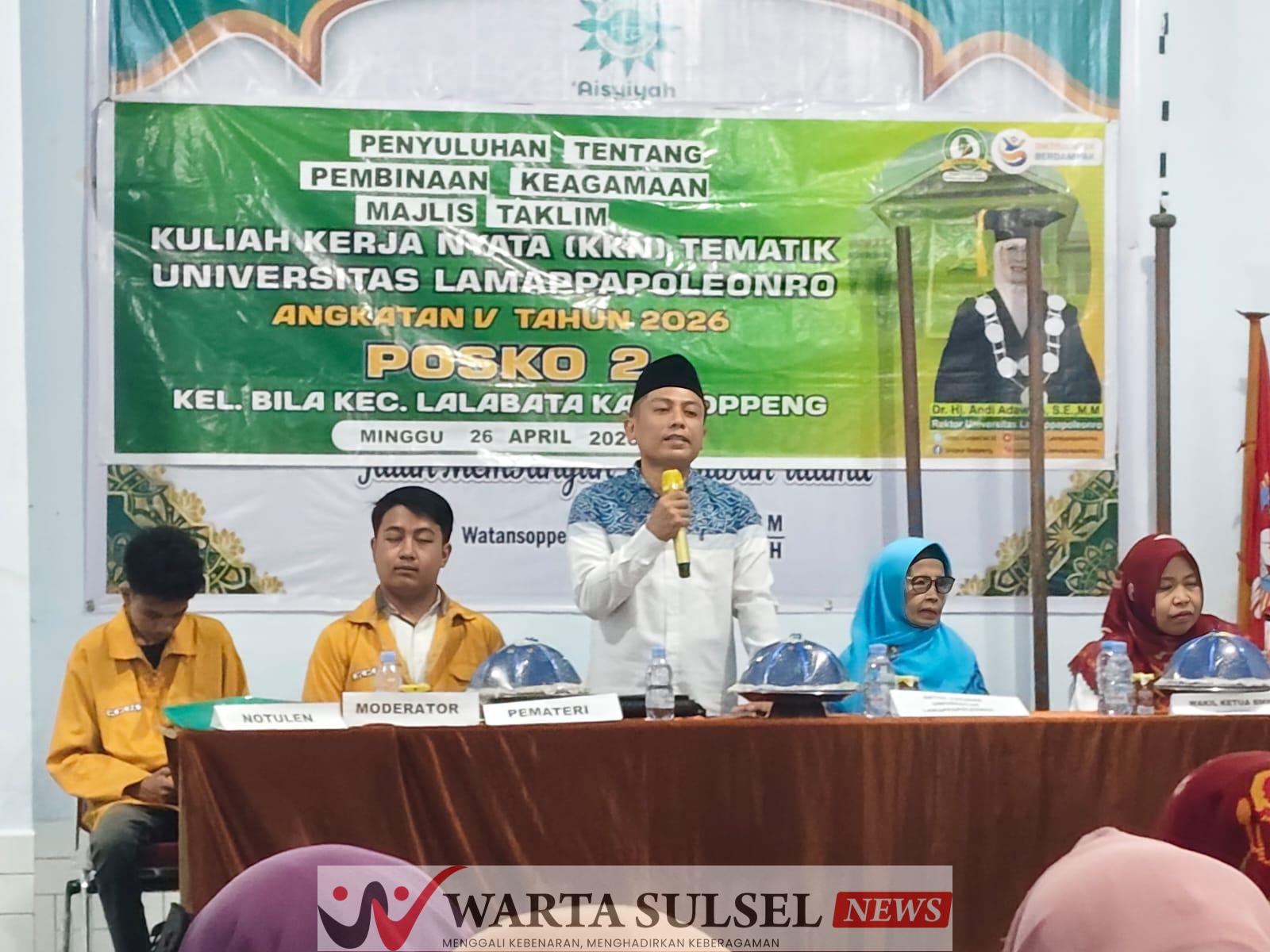 WARTASULSELNEWS.COM – Kegiatan Kuliah Kerja Nyata (KKN) Tematik mahasiswa Universitas Lamappapoleonro (UNIPOL) Soppeng kembali menghadirkan kontribusi nyata bagi masyarakat melalui penyuluhan keagamaan yang dilaksanakan di Kelurahan Bila, Kecamatan Lalabata, Kabupaten Soppeng, Minggu malam (26/04/2026).
